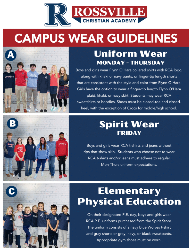 RCA’s uniform is designed to help create an educationally conducive, non-distracting environment in which all students are dressed in a clean, neat, and modest fashion. All students are required to wear uniforms every day, with the exception of special events, such as Homecoming. RCA uses FlynnO’Hara as our sole provider.